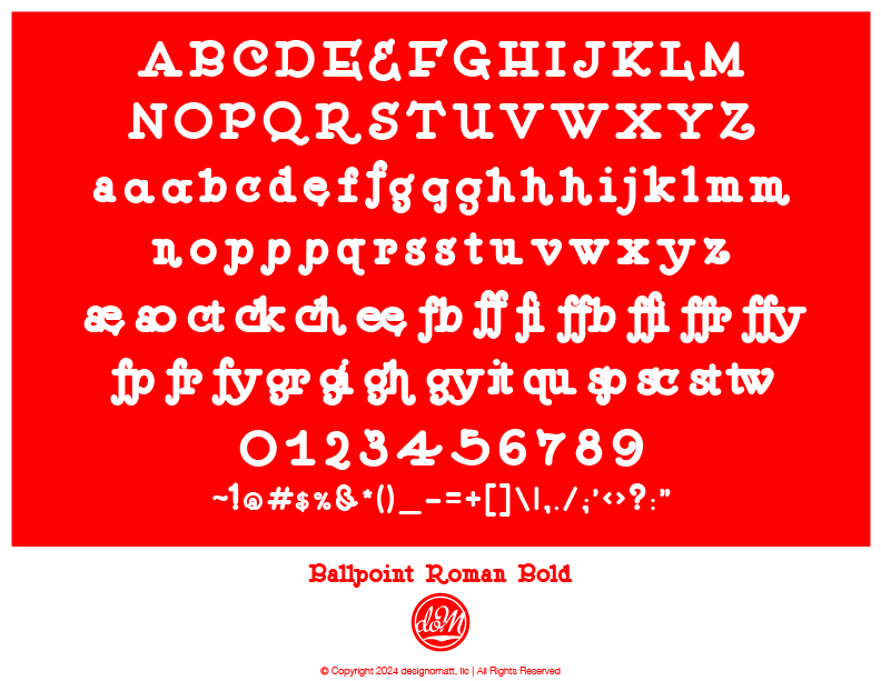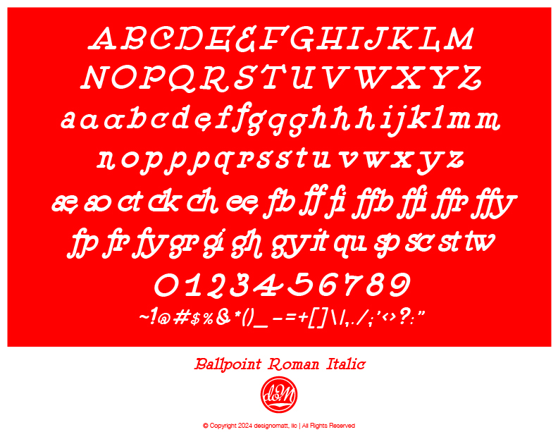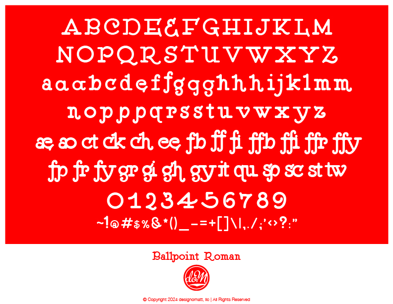 Announcing the general availability of our newest font family, Ballpoint Roman; based on a sign painter’s sample sheet from the early 20th Century and complete with some alternate characters and ligatures.
